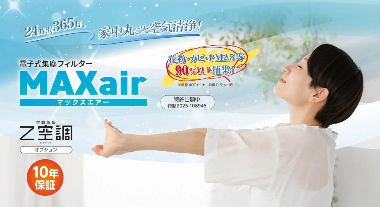 24時間365日家中まるごと空気清浄する電子式集塵フィルタ「MAXair」で、家中の空気をパワフルに清浄し、これまでにない快適な住空間をお届けします。